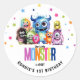 Monster thème amusant et coloré 1er Anniversaire Sticker de fête. Notre petit monstre est UN ! Le design comprend un groupe de mignons monstres colorés d'aquarelle, des confettis d'étoiles, des texte en arc-en-ciel gras, nom et âge.