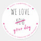 Nous Aimons Votre Chien ! Envoyez des voeux de vacances mignons et amusants avec cet adorable autocollant de jour de valentines chien dans un design rose. Cet autocollant pour chien de jour valentines sera un favori de tous les amoureux de les chiens. Idéal pour les affaires d'animaux de compagnie, les gardiens de chiens, les promeneurs de chiens et les toiletteurs de chiens. Personnalisez avec votre nom d'entreprise et votre message. DROIT D'AUTEUR © 2020 Judy Burrows, Black Dog Art - Tous droits réservés. Nous Aimons Votre Chien D'Affaires Animaux Valentines Jour Classic Sticker Rond