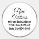 'Nouvelle adresse' apparaît dans un script noir en haut. Vous pouvez modifier le script si vous le souhaitez. Il y a d'autres lignes de texte d'affichage sous le script. Vous pouvez les modifier pour afficher votre nom et votre nouvelle adresse. Le texte est dans un cercle blanc avec une bordure fausse (pas de feuille) argentée. C'est un grand autocollant à ajouter aux cartes et enveloppes de Noël pour faire savoir à tout le monde que vous avez déménagé.