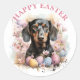 Joyeux autocollants de Pâques avec un dachshund aquarelle avec des fleurs et des oeufs au chocolat de Pâques. Personnalisable .