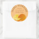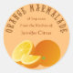 Conception ronde avec un arrière - plan orange tangerine pâle avec un orange plein et deux sections découpées d'oranges au fond. En gros trait de lettrage autour de la moitié supérieure sont les mots Orange Marmalade. La zone centrale a trois lignes personnalisées sous forme modèle que nous avons utilisées pour la date, l'origine et le nom.