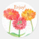 Un autocollant coloré avec "Enjoy" décoré de trois fleurs de zinnia dans les tons rouge, rose et orange avec de l'aquarelle et des touches de bec dans l'arrière - plan pour ajouter de la couleur. Dans le langage des fleurs zinnias signifie pensées d'amis absents. Finition joyeuse à votre emballage!