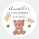 Ces étiquettes autocollants ont un thème de miel et d'abeilles mignonnes. Un mignon petit ours qui mange du miel est représenté en bas avec deux abeilles qui bourdonnent près. Un tableau d'abeilles illustre la zone de texte au centre. Un exemple de nom est imprimé au-dessus d'un événement, "Baby shower" suivi de la date de la célébration. Vous pouvez personnaliser les autocollants pour inclure vos propres informations de fête ou d'autres textes personnalisés.