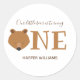 Notre petit ours tourne un autocollant pour le premier anniversaire de naissance. Elles sont blanches et brunes avec le mot "Un" en grandes lettres avec une illustration du visage d'ours comme première lettre du mot. Simplement, customisez ces autocollants, ajoutez-les à votre panier et joyeux anniversaire à votre merveilleux bébé! Bear Turner un animal mignon Premier anniversaire Classic Round Sticker Conception des jours fériés | ©Melissa Patton - Artiste/Illustrateur