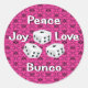 Voici un design graphique inspirant que vous pouvez partager avec d'autres joueurs de bunco. Ce message positif dit : Paix, Joie, Amour et Bunco. Achetez-en un en cadeau ou en prix. Personnalisez avec votre propre nom, nom de groupe ou date.