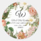 Sceau d'enveloppe de retour d'adresse rond avec votre monogramme, nom et adresse. Parfait pour ajouter une touche décorative et sceller les enveloppes pour les invitations de mariage et les fêtes de douche de mariée. Élégante illustration botanique vintage dans un nouveau design moderne. Corail pêche, rose avec des fleurs élégantes blanches conçues par l'artiste, Audrey Jeanne Roberts. Copyright.