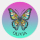 Autocollant personnalisé avec un joli papillon coloré en violet, turquoise, bleu et jaune.