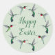 Joli autocollant "Happy Easter" avec des colibris à gorge rubis sur un arrière - plan vert clair.