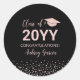 Cet autocollant moderne de fête de graduation présente la typographie rose de l'or "Classe de 20YY (votre année de graduation)" et un graphique de casquette de graduation avec arrière - plan confetti. Vous pouvez customiser le texte en noir. D'autres options de couleur et des fournitures de fête sont disponibles à ma boutique BaraBomDesign.