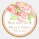Matching Save the Date, fiançailles enveloppe invitation sceau ou autocollant avec un élégant bouquet moderne fleuri rose élégant, avec ruban satiné, arc et perles délicatement peint en aquarelles par Audrey Jeanne Roberts. Droit d'auteur .