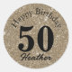Ce étiquette autocollant personnalisé dispose d'un arrière - plan parties scintillant or glamour. Un exemple de message d'anniversaire de 50ème anniversaire est imprimé en haut, suivi d'un exemple de nom dans une police de script élégante. Vous pouvez personnaliser les autocollants pour inclure votre propre type d'événement ou année d'anniversaire.
