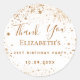 Ajoutez une touche de glamour à votre célébration avec cet autocollant rond élégant, parfait pour une fête de 21e anniversaire girly et glamour, ou tout âge spécial! Doté d'un arrière - plan blanc chic et d'une poussière de parties scintillant en faux or foncé, le design respire l'élégance. Le texte "Merci" est magnifiquement écrit dans un grand script moderne écrit à la main, ce qui en fait un détail attrayant. Personnalisez l'autocollant en ajoutant le nom de la fille d'anniversaire, son âge et la date de la fête pour une touche mémorable et personnalisée. Idéal pour les faveurs, les cadeaux ou les notes de remerciement !