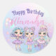 Cet autocollant de fête d'anniversaire mignon présente un thème de la mode parties scintillant poupées. Trois poupées filles aux cheveux colorés et tenues mignonnes sont placées en bas. Une poupée tient des ballons et des étoiles roses sont placées autour d'eux. Les étoiles de parties scintillant d'or sont placées le long des parties inférieure et supérieure. L'arrière - plan est un motif arc-en-ciel irisé. Un exemple de message "Joyeux anniversaire" est imprimé en haut dans une police violet fantaisiste. Un exemple de nom est imprimé ci-dessous dans une police de script rose. Vous pouvez personnaliser les autocollants pour inclure votre propre nom personnalisé ou autre texte.