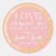 La touche de finition parfaite pour une faveur de mariage alimentaire, cette fausse parties scintillant d'or et autocollant rond en coquille présente des noms et une date mariage ainsi qu'un doux message d'amour. Ce étiquette est un mélange chic et moderne avec un peu de scintillement et il aurait l'air bien sur les jarres, les boîtes, les boîtes à menthe et même de fermer un paquet emballé. N'oubliez pas de personnaliser avec votre nom, la date de l'événement et de changer la couleur de l'arrière - plan à l'un de vos choix en appuyant sur le bouton bleu modifier la conception.