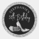 Elégant et chic moderne Argent et noir Anniversaire Personnalisé Sceau ou Favor Étiquettes avec Faux Parties scintillant Silver High Heel Stiletto Chaussures et nom personnalisé et année d'anniversaire dans le script moderne de calligraphie whimsical tendance cursive en noir et blanc.