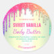 Parties scintillant gouttes de couleur arc-en-ciel sur un arrière - plan de style holographique pour les soins du visage et du corps, ou des produits de soins de la peau et des spas. Cet autocollant dit le beurre de corps mais les possibilités sont infinies pour ce étiquette de produit glam! S'IL VOUS PLAÎT LIRE : Ces autocollants ne brillent pas, ne brillent pas ou ne reflètent pas la lumière, ils ont simplement une image d'une cale brillante.