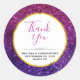 Mariage merci autocollants avec un design élégant et élégant. L'arrière - plan composé de pierres de parties scintillant brillantes rose et violet. Une ambiance tendance et féminine. Un cercle avec une bordure en feuille d'or imitant superposée avec votre texte à l'intérieur.
