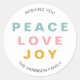 Un autocollant de Noël moderne minimal avec des couleurs vives et joyeuses pour répandre un peu de gaieté et d'amour cette saison de vacances. Un message personnalisable de "Wishing You" est suivi de "Peace", "Love" et "Joy" dans des couleurs turquoises, roses et dorées et de la typographie simple. Vous pouvez personnaliser avec votre nom de famille.