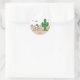 This circular Peanuts sticker features a humorous, non-traditional holiday scene set in a desert or arid landscape with a pale pink/tan ground. Snoopy, wearing a cowboy hat, is shown holding an electrical plug, connecting a string of colorful Christmas lights that are already draped around a large saguaro cactus. This officially licensed sticker is a fun, Southwestern-themed piece of seasonal merchandise, perfect for celebrating a warm-weather Christmas, decorating gifts, or adding a unique touch of Peanuts charm to any item.