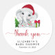 autocollant de la saison des Fêtes de Noël pour votre bébé garçon douches faveurs et la correspondance avec "merci" dans un script rouge élégant avec des swashes et une jolie aquarelle d'un petit garçon éléphant avec un chapeau de Père Noël, un arbre de Noël, un sucre de canne rouge et vert et des cadeaux. Ajoutez le nom et la date de la douche de la mère dans une simple typographie moderne.