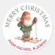 Un autocollant de Noël mignon pour les cadeaux, les paquets, les cartes de Noël, les faveurs de fête et plus encore, ce design présente un texte circulaire entourant une illustration colorée d'un elfe sur skis. Modifiez les noms affichés avec vos propres noms ou d'autres textes.