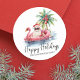 Happy Holidays Tropical Beach Père Noël Classic Round Sticker. Célébrez la saison avec une touche tropicale en utilisant cet autocollant rond amusant. Doté d'un Père Noël décontracté en lunettes de soleil, allongé sur un flotteur flamand rose dans l'océan, cet autocollant apporte une ambiance de plage à vos vacances. Le design comprend un palmier décoré de décorations, de douces vagues de l'océan et une petite île en arrière - plan, le tout dans un charmant style aquarelle rustique. Parfait pour ajouter une touche côtière ludique à vos enveloppes de cartes de vacances, faveurs de fête ou emballages festifs. Avec un mélange de polices décontractées et de typographie de script, c’est une façon unique de répandre la joie des vacances, surtout pour ceux qui aiment les destinations tropicales ou le look plage.