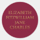 Sticker avec les prénoms des principaux personnages de Pride et Préjugés par Jane Austen : Elizabeth, Fitzwilliam, Jane, Charles en faux or contre un arrière - plan rougeâtre violet. Un autocollant parfait pour les amateurs de livres et les fans de Jane Austen.