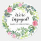 Nous sommes engagés est écrit au centre d'une couronne de roses rouges et roses. Le nom du couple engagé est écrit ci-dessous. Beaucoup de feuilles verts et de vignes créent une belle aquarelle conception de couronne. Utiliser sur les enveloppes de fiançailles ou les faveurs de la fête.