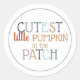 Amusant pour l'automne ou l'Halloween, cet autocollant rond présente un design élégant et coloré qui dit, "Cutest petit citrouille dans le patch."
