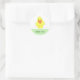 Un mignon petit canard jaune avec un gros bec orange et une expression mignonne. Une bordure verte douce avec des points blancs.