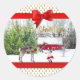 Design photo personnalisable pour vos Joyeux Vacances. Motif arrière - plan douillet avec des arbres de Noël de couleur dorée, un cadre de rubans rouges et un script de calligraphie de Noël joyeux et doré. Personnalisez en changeant la photo et le texte. Joyeuses fêtes !