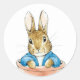 Pierre le lapin dans sa veste bleue, assis dans un pot en terre cuite.