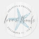 Un autocollant étiquette pour mariage à la plage ronde pour un mariage à la plage rustique avec une illustration vintage d'étoiles de mer et une police serif classique et une élégante calligraphie écriture manuscrite "amour et merci" avec des noms et date mariage. Cliquez sur CUSTOMISER PLUS LOIN pour modifier les couleurs ou les polices afin de les coordonner avec votre événement.