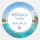 Autocollants de cuisine avec une belle photo représentant une station balnéaire tropicale. Jolie plage de sable blanc et d'eau bleue avec des paillotes, ce qui lui donne une ambiance insulaire tranquille. Un cercle blanc superposé avec votre texte à l'intérieur.