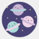 Des planètes mignonnes aux visages kawaii et de minuscules étoiles dans l'espace. Couleurs pastel sur un arrière - plan bleu foncé.