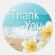 Jolie Plumeria Starfish Beach merci sticker. Pour toute question ou demande, envoyez un courriel à glamprettyweddings.com/contact. Des invitations de mariage assorties, enregistrer les dates, enveloppes, postage, cartes RSVP, autocollants ronds et carrés, faveurs magnétiques et bien plus encore sont disponibles. "Plumeria Beach" design original par Cheryl Daniels © 2013.