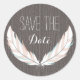 Des économies l'autocollant de date comportant une illustration d'une paire de plumes. L'arrière - plan est barnwood inspiré.