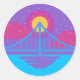 Un pont brillant dans les tons rose rouge contre un ciel nocturne violet onirique, une pleine lune lumineuse brille derrière des nuages dérigeants tandis que son reflet brille à travers l'eau calme en contrebas.