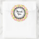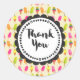 Un autocollant de remerciement avec un motif sucré en été avec des popsicles et des cônes de crème glacée dans des aquarelles colorées et vibrantes. Merci écrit dans une police tendance à l'intérieur d'un cadre rond avec une forme de fleur fantaisiste.