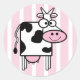 Un design amusant poster de animal girly avec une vache souriante contre un arrière - plan large rayé en rose et blanc.