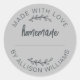 Autocollant gris doux fait avec amour avec une typographie noir délavé et un design de lettrage manuscrit. Parfait pour sceller les pâtisseries, les pots de confiture, les biscuits, le pain, les boîtes à tarte, l'emballage des petites entreprises, les faveurs de fête et les cadeaux faits à la main. Comprend une ligne de nom personnalisable, ce qui la rend idéale pour les boulangers à domicile, les artisans et les petites marques qui recherchent une finition propre et discrète.