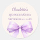 A soft ivory background color. Decorated with a large lavender colored bow. Personalize and add the name and date.