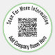 Une image d'affichage est au centre de l'autocollant. Vous pouvez le remplacer par votre code QR. Il existe deux lignes de texte d'affichage noir que vous pouvez modifier pour afficher votre message personnalisé. (Montré : Rechercher plus d'informations Ajouter le nom de l'entreprise ici) Ces autocollants ont du texte noir dans un cercle blanc. L'autocollant a une bordure vert clair.