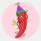 Un personnage de dessin animé rouge et poivre chaud. Version avec casquette de fête et corne bruyante. Arrière - plan rose pastel. Autocollants décoratifs pour anniversaire. Idée enveloppante cadeau.