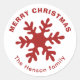 Sticker Rond Rouge Simple Snowflake Joyeux Noël Famille Classique. Le design a un simple flocon de neige rouge moderne sur un arrière - plan blanc, un joyeux texte de Noël et nom de famille. Vous pouvez modifier le texte Joyeux Noël.