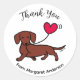 Sticker rond rouge lisse Dachshund Smiling Heart Merci classique pour les fans de Doxie. Caricature de chien mignon créée par Naomi Ochiai du Japon. Doxie livre un ballon du Coeur Rouge à quelqu'un.