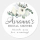Autocollant parfait pour sceller les notes ou faveurs de remerciement de baby shower de mariée. Des roses blanches ivoire entourées sont nichées dans des feuilles d'eucalyptus. Le nom de la mariée est écrit dans un grand texte de script charmant. Cet autocollant de baby shower de mariée fait partie de la collection Rustique Fleur Blanche de Baby Shower de Mariée.