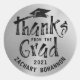 Texte moderne de brosse imprimée à la main REMERCIEMENTS DE LA PROMO autocollants ou sceaux personnalisés avec le nom du diplômé et l'année de promotion en noir sur argent métallisé. Utilisez comme autocollants de faveur de fête de remise de diplômes ou sceaux de remerciement sur les enveloppes de cartes de remerciement. Contactez le concepteur via Zazzle Chat ou makeitaboutyoustore@gmail.com si vous souhaitez que ce design soit modifié ou sur un autre produit.