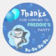 Un Merci personnalisé pour être venu à ma fête moderne requin thème enfant autocollant d'anniversaire avec un petit requin mignon tenant un tas de ballons bleus sur un arrière - plan bleu avec texte stylisé d'ombre avec le thème "Do-Do-Do-Do".