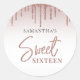 Soirée douce moderne et élégante de 16 ans Sticker rond classique vous pouvez facilement customiser avec vos détails de fête. Avec goutte de parties scintillant avec arrière - plan de gradient or rose et typographie de script.